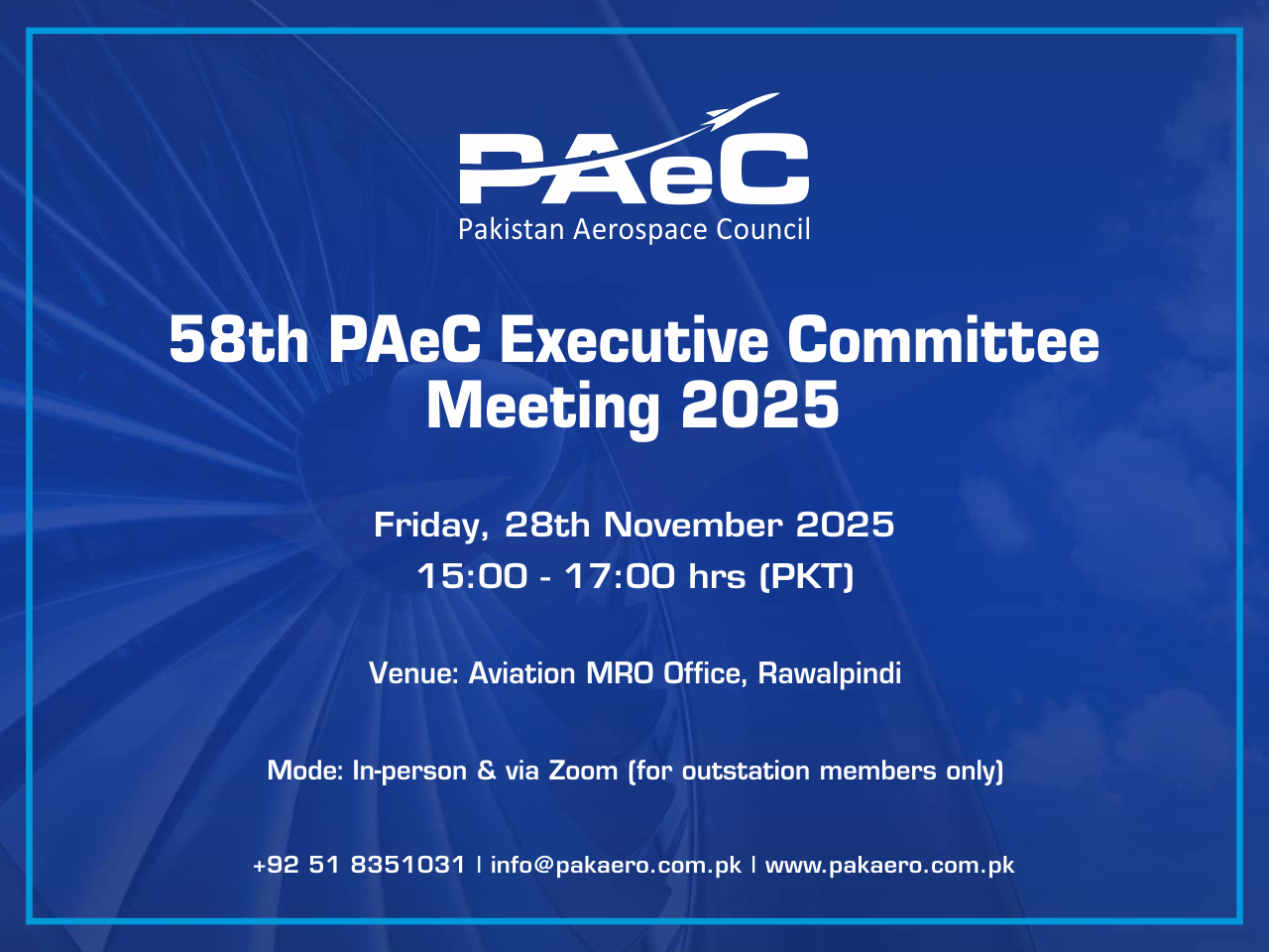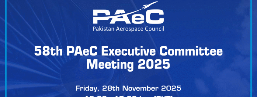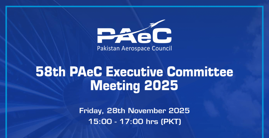 Pakistan Aerospace Council (PAeC) is pleased to announce its 58th Executive Committee Meeting, scheduled for Friday, 28th November 2025, from 15:00 to 17:00 hrs at Aviation MRO Office, Rawalpindi.