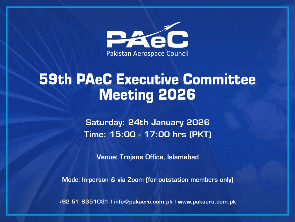 The 59th Executive Committee Meeting of the Pakistan Aerospace Council (PAeC) will be held on Saturday, 24th January 2026, at the Trojans Office, Islamabad.